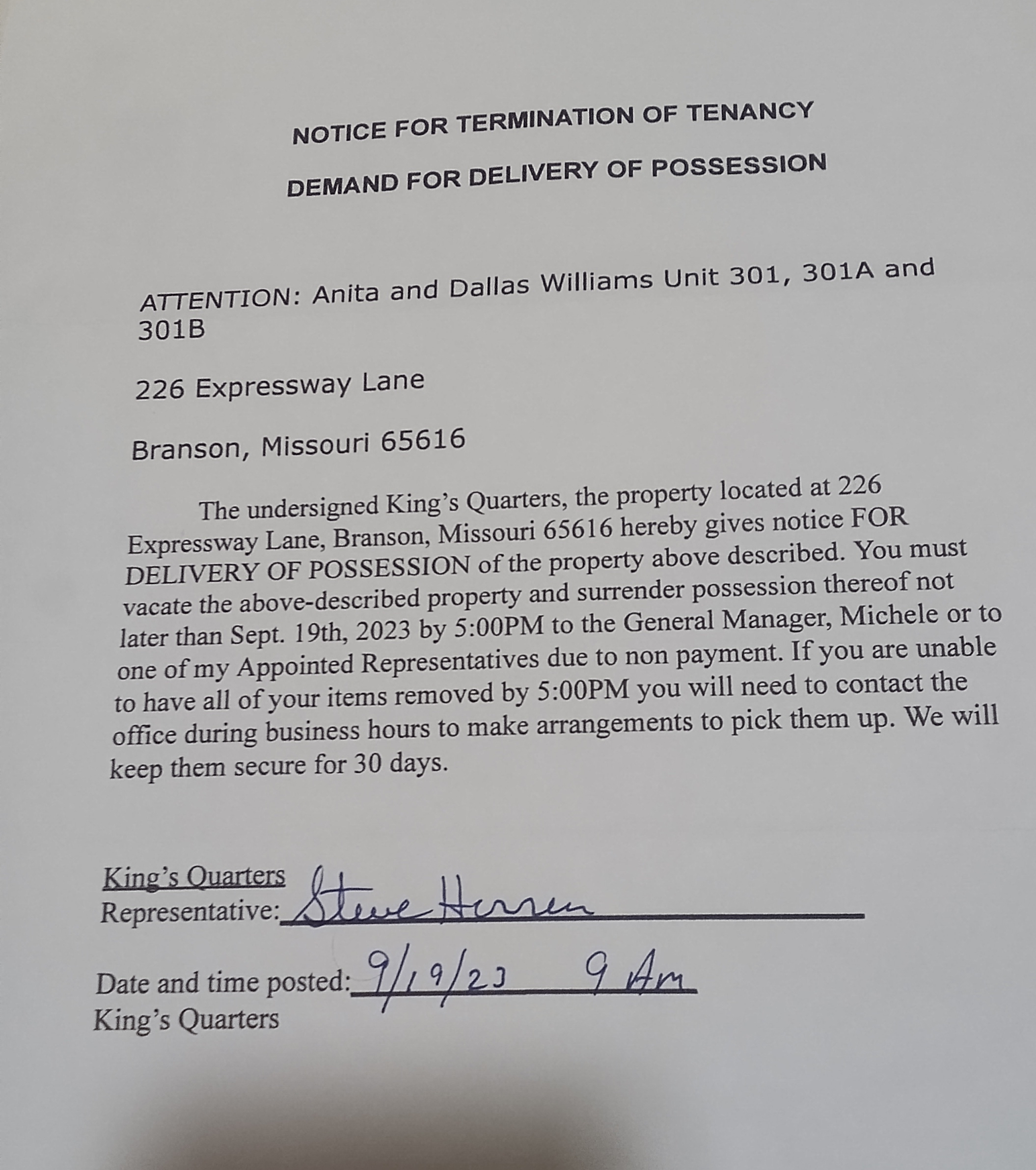 On Monday, September 11, 2023 my wife and son went to her office to pay the “2nd week” rent “EARLY” as we had it available and decided to pay in advance. “INCLUDED IN THE LEASE IT STATES PAY IN “ADVANCE”. Rent was due on Thursday, September 14, 2023 but we decided to pay in “ADVANCE”. Michelle knew that. From the moment she took our last dollar she started the “HOTEL” game and invited the Branson Police Department to participate.