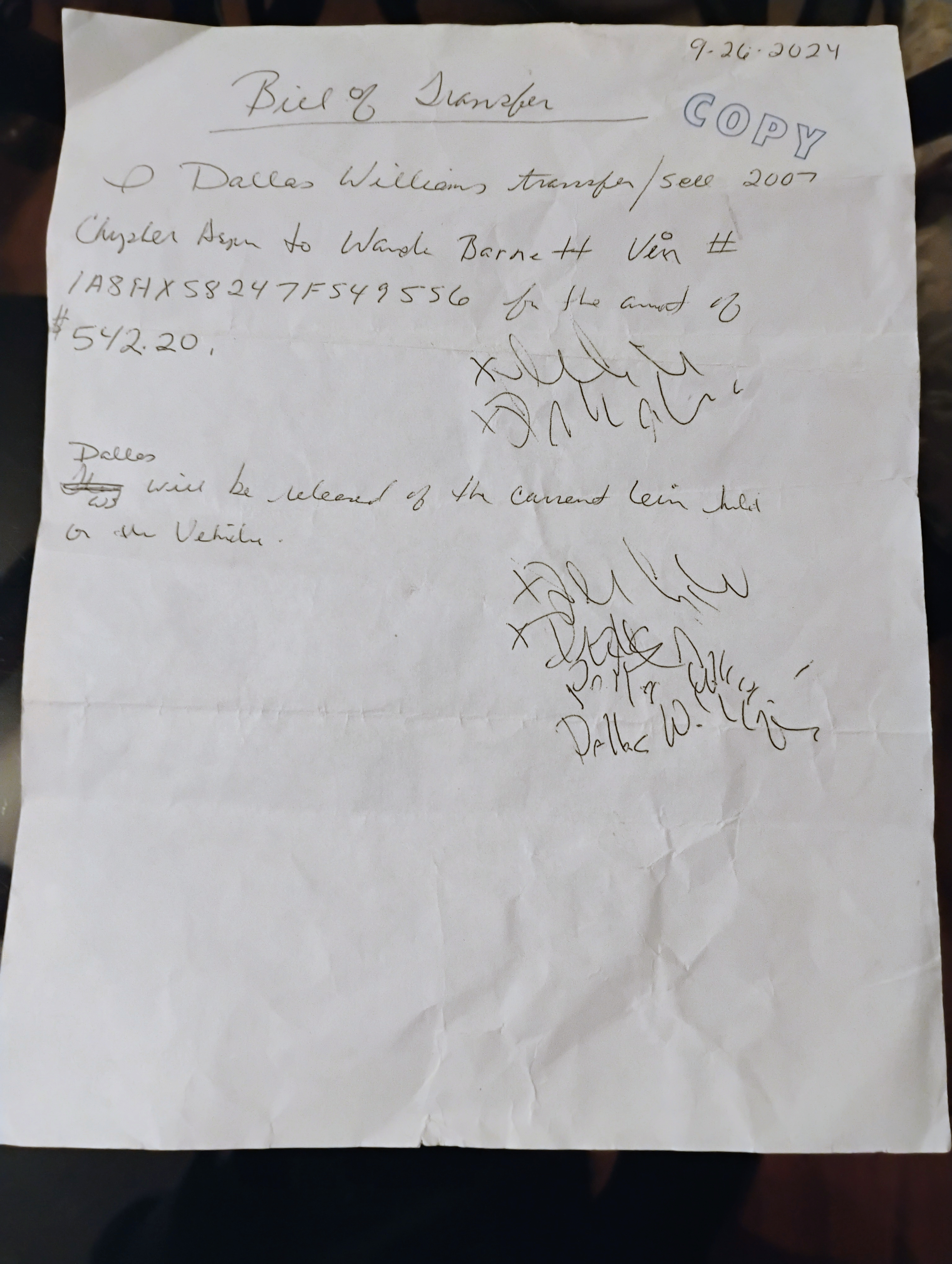 1) My vehicle title transferred under “QUESTIONABLE” circumstances involving Branson PD presence. They followed me to my hotel hole, to make sure I gave Wanda the car. “EVERYONE MADE THE DECISION BUT ME” – My signature shows my frustrations.